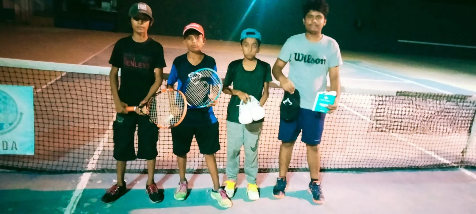 PLAYE collected used and new tennis rackets, bags, accessories and donated them to Sindh Tennis Association - pictured here are some of the youth who received the items.